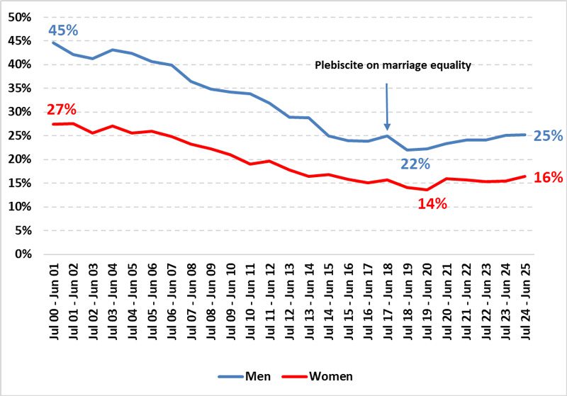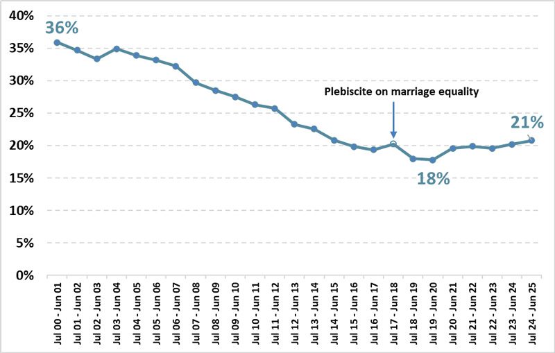 In 2000–01, 36 per cent of Australians agreed. That number fell below 30 per cent by 2008–09, then dipped under 20 per cent in 2016–17 ahead of the marriage equality debate and legislation. The lowest level recorded was 18 per cent between 2018 and 2020.