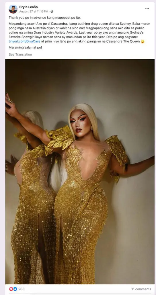 While public voting was open for the award, Cassandra posted a message from her non-drag account on August 27 to the Facebook group "Drag Scene Stanposting", which has almost 90,000 members.
